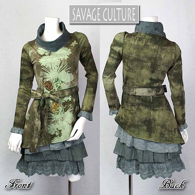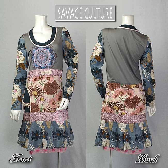 "SAVAGE CULTURE"フラワー刺繍と裾の段々切替が綺麗なワンピース サイズSとMとL 正面・背面画像 ろうけつ染め風のプリントを施した100%コットン素材の長袖ワンピース。 フラワー柄の所々に刺繍を施した綺麗な仕上げ。 裾を少し斜めライン段々に切替えて、お洒落感をだしています。 左脇ファスナー仕上げ。 撮影用トルソーはサイズSを着用。 Size 【表示サイズ】サイズSとMとL。 【サイズS実寸】バスト約79cm、ウエスト約72cm、肩幅約33cm、袖丈約57.5cm、アーム幅約18.5cm×2、総丈約90.5cm。 【サイズM実寸】バスト約84cm、ウエスト約77cm、肩幅約35.5cm、袖丈約59.5cm、アーム幅約19.5cm×2、総丈約91.5cm。 【サイズL実寸】バスト約92cm、ウエスト約85cm、肩幅約36.5cm、袖丈約59.5cm、アーム幅約20.3cm×2、総丈約91.5cm。 袖口と裾段々切替以外少し伸縮性あり。袖のみ裏地なし。透け感なし。 【重さ】約400g(サイズS。) ★一着ごとにメジャーで採寸しておりますので、若干の誤差が出る可能性がございます。 目安としてご理解ください。採寸の方法についてはこちらをご覧ください。 Color グレー濃淡、グラスグリーン濃淡、アボガド(刺繍イエローゴールド、グリーン、ブラウン)。 ★画像については本来の色が表示されるよう調整しておりますが、お客様のご覧になる機器により若干違って見えることがあります。ご了承ください。 トルソーサイズ 黒トルソー: 9号 バスト81.5cm、ウエスト59.5cm、ヒップ87cm。9号 バスト82cm、ウエスト55cm、ヒップ81cm。 足付きトルソー: 9号 バスト82cm、ウエスト58cm、ヒップ84cm、身長は約170cm(頭付きとした場合)。 材 質 【材質】100% COTTON。 インド製。"SAVAGE CULTURE"はスペインのメーカーです。 その他