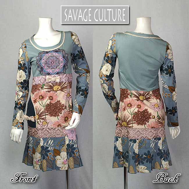 "SAVAGE CULTURE" 刺繍とリボンモチーフがキュートなワンピース サイズSとM 正面・背面画像 「大きめのフラワー柄や、飾り柄のプリント生地」、「スレートグレイ生地」、「飾り柄刺繍生地」で切り替えたコットン素材の長袖ワンピース。 胸元などにあしらわれた綺麗な飾り柄刺繍がポイント。 リボン モチーフやフラワーカット刺繍でキュートな仕上げ。 ポックスプリーツをいれた切替裾デザイン。 左脇ファスナー仕上げ。 撮影用トルソーはサイズSを着用。 Size 【表示サイズ】サイズSとM。 【サイズS実寸】バスト約76cm、ウエスト約68cm、肩幅約33.5cm、袖丈約60.5cm、アーム幅約20.5cm×2、総丈約94cm。 【サイズM実寸】バスト約80cm、ウエスト約76cm、肩幅約35.5cm、袖丈約60.5cm、アーム幅約22cm×2、総丈約95cm。 少し伸縮性あり。裾のボックスプリーツ部分のみ裏地あり。透け感なし。 【重さ】約310g (サイズS) ★一着ごとにメジャーで採寸しておりますので、若干の誤差が出る可能性がございます。 目安としてご理解ください。採寸の方法についてはこちらをご覧ください。 Color ダークアクア、スレートグレイ、ライトピンク、ベージュ、ブラウン、他。 ★画像については本来の色が表示されるよう調整しておりますが、お客様のご覧になる機器により若干違って見えることがあります。ご了承ください。 トルソーサイズ 黒トルソー: 9号 バスト81.5cm、ウエスト59.5cm、ヒップ87cm。9号 バスト82cm、ウエスト55cm、ヒップ81cm。 足付きトルソー: 9号 バスト82cm、ウエスト58cm、ヒップ84cm、身長は約170cm(頭付きとした場合)。 材 質 【材質】95% COTTON、5% ELASTANE。 インド製。"SAVAGE CULTURE"はスペインのメーカーです。 その他