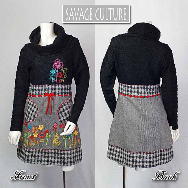 【合わせ買い対象】OUTLET スペイン "SAVAGE CULTURE" バイヤーIKUKOお薦め! フラワー刺繍と半円ポケットが可愛いオフタートルネック ワンピース サイズSとM 【ウール混】【当初28704】
