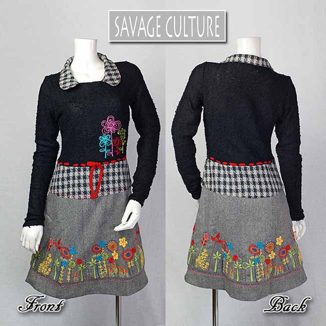 "SAVAGE CULTURE" バイヤーIKUKOお薦め! 丸襟と裾の刺繍が可愛いワンピース サイズSとM 正面・背面画像 ブラック ニット生地と100%ウール生地をウエストで切替えた長袖ワンピース。 可愛い丸襟デザイン。 裾の可愛いフラワー刺繍とウエスト切替位置のレッド リボン紐ステッチがポイント。 サイズSは右ファスナー、サイズMは左ファスナー仕上げ。 撮影用トルソーはサイズSを着用。 Size 【表示サイズ】サイズSとM。 【サイズS実寸】バスト約81cm、ウエスト約67cm、肩幅約33cm、袖丈約63cm、アーム幅約20cm×2、総丈約90cm。 【サイズM実寸】バスト約87cm、ウエスト約73cm、肩幅約35cm、袖丈約63cm、アーム幅約22.5cm×2、総丈約93cm。 ブラック生地のみ少し伸縮性あり。スカート部分裏地あり。透け感なし。ニットのチクチク感なし。フィット感あり。 【重さ】約440g (サイズS) ★一着ごとにメジャーで採寸しておりますので、若干の誤差が出る可能性がございます。 目安としてご理解ください。採寸の方法についてはこちらをご覧ください。 Color グレー、ブラック、他。 ★画像については本来の色が表示されるよう調整しておりますが、お客様のご覧になる機器により若干違って見えることがあります。ご了承ください。 トルソーサイズ 黒トルソー: 9号 バスト81.5cm、ウエスト59.5cm、ヒップ87cm。9号 バスト82cm、ウエスト55cm、ヒップ81cm。 足付きトルソー: 9号 バスト82cm、ウエスト58cm、ヒップ84cm、身長は約170cm(頭付きとした場合)。 材 質 【材質】50% ACRYLIC、30% POLYESTER、20% WOOL。裏地: 100% OLYESTER。 インド製。"SAVAGE CULTURE"はスペインのメーカーです。 その他