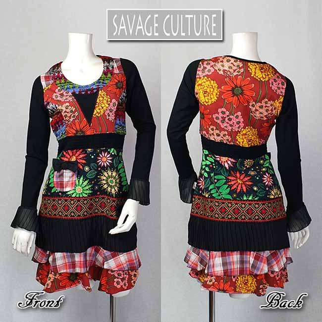 "SAVAGE CULTURE" リボンと裾の段々切替が可愛いフラワー プリント ワンピース サイズSとM 正面・背面画像 ニット織生地やコットン生地等、5種類の生地で切替えた長袖ワンピース。 小さな右ポケットやブラック リボン モチーフがとてもキュート。 プリーツ生地で袖口を切替えたコルネット袖デザイン。 刺繍生地やチェック生地の段々切替が可愛らしさを演出。 ハイウエスト切替部分に伸縮ゴムを縫い込んだフィット感あるシャーリング仕上げ。 撮影用トルソーはサイズSを着用。 商品により柄域が異なります。 Size 【表示サイズ】サイズSとM。 【サイズS実寸】バスト約78cm、ハイウエスト約62cm、肩幅約30cm、袖丈約59cm、アーム幅約19.7cm×2、総丈約89.5cm。 【サイズM実寸】バスト約87cm、ハイウエスト約70cm、肩幅約31cm、袖丈約61.5cm、アーム幅約21.5cm×2、総丈約91cm。 伸縮性あり。裏地なし。透け感なし。 【重さ】約300g(サイズS。) ★一着ごとにメジャーで採寸しておりますので、若干の誤差が出る可能性がございます。 目安としてご理解ください。採寸の方法についてはこちらをご覧ください。 Color ブラック、ワインレッド、黄緑、グリーン、イエロー、他。 ★画像については本来の色が表示されるよう調整しておりますが、お客様のご覧になる機器により若干違って見えることがあります。ご了承ください。 トルソーサイズ 黒トルソー: 9号 バスト81.5cm、ウエスト59.5cm、ヒップ87cm。9号 バスト82cm、ウエスト55cm、ヒップ81cm。 足付きトルソー: 9号 バスト82cm、ウエスト58cm、ヒップ84cm、身長は約170cm(頭付きとした場合)。 材 質 【材質】100% CO Liberty。80% CO-COTTON、10% PA-POLIAMIDE、10% PL-POLYESTER。 ヨーロッパ製 Made in Europe。 その他