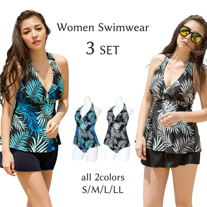 水着 3点セット 体系カバー レディース カバーアップ タンキニ クール ママ リゾート ビーチ マリンスポーツ ボタニカル 植物 S M L LL ブラック ブルー