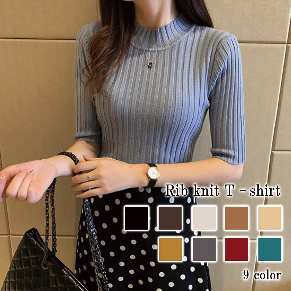 Tシャツ レディース リブニットTシャツ コーデ ブラウス ブランド ロング 薄手 半袖 かわいい 涼しい 大人 ブラック カジュアル ティーシャツ Vネック 7分袖 トレーナー 無地 人気 春 シャツ ジム 夏 ロゴ おしゃれ ゆったり スポーツ 40代 5分袖 カットソー