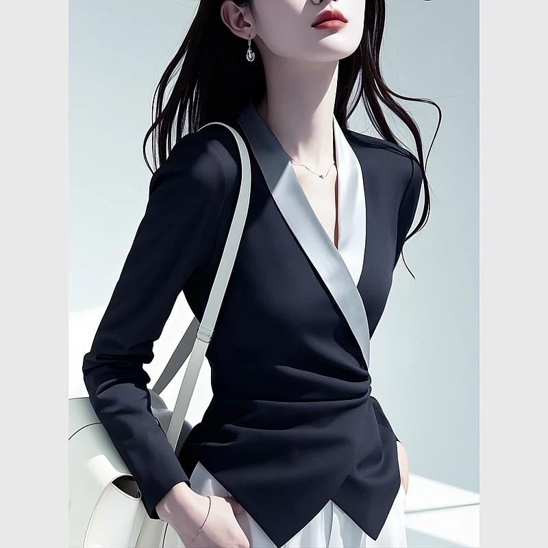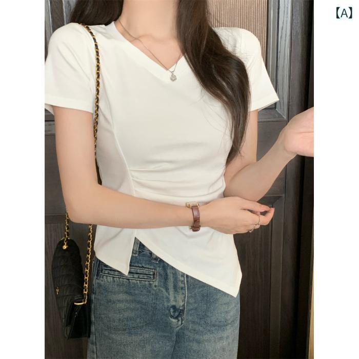 レディース Vネック シャツ 女性用 春 ハイエンド ウエスト イレギュラー ショート丈 シンプル キレイ目 カジュアル トップス