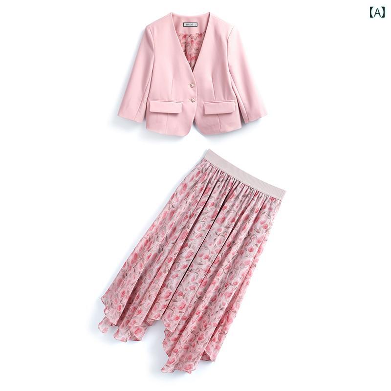 レディース ファッション オシャレ カワイイ 女性用 Vネック ショート ブレザー プリント イレギュラー スカート