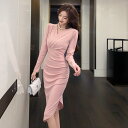 夏コーデ レディース ファッション 服 オシャレ カワイイ 女性用 シンプル 大人カワイイ 大きいサイズ 婦人服 Vネック スリット イレギュラー プリーツ ヒップカバー 長袖 ドレス イブニングドレス