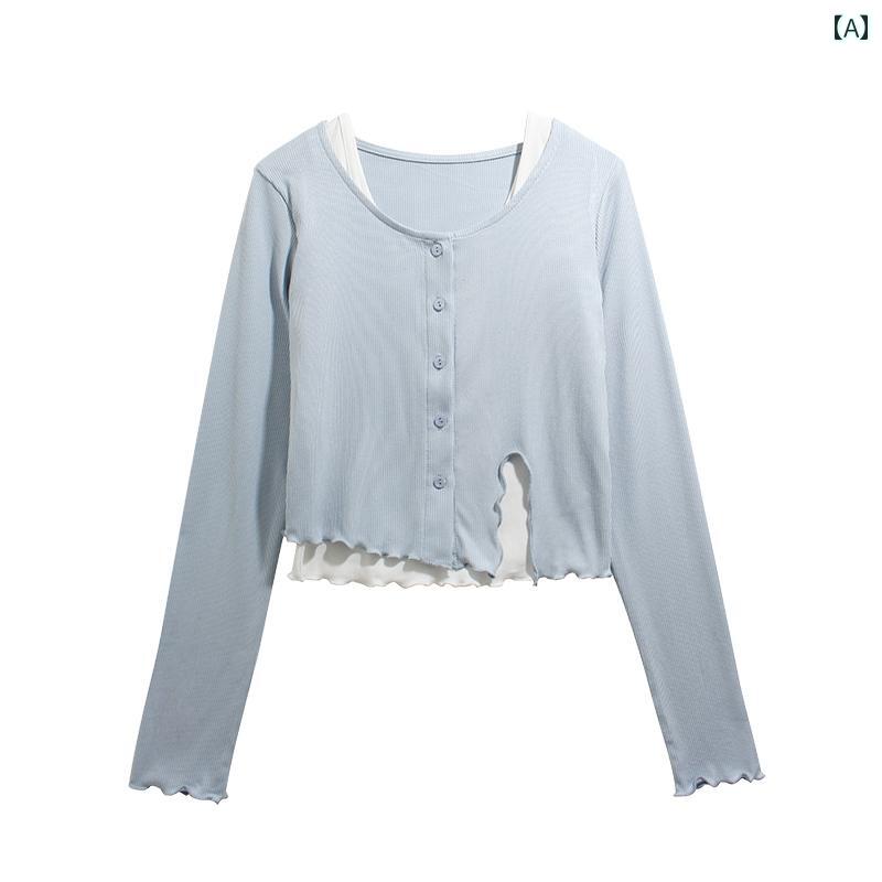 レディース トップス スリム スタイリッシュ おしゃれ 初秋 女性 U ネック 長袖 T シャツ 裾 短い フィット イレギュラー レイヤリング