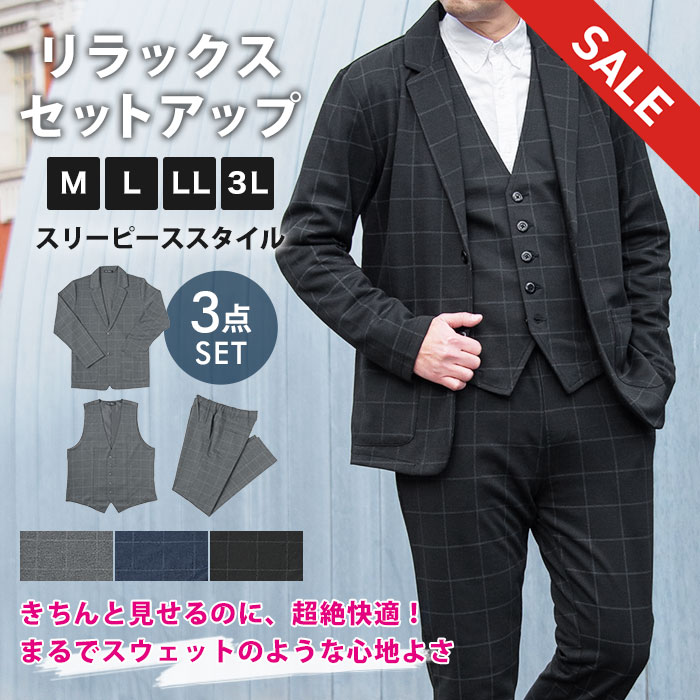 【スーパーSALE 半額】 セットアップ スリーピーススーツ 裾上げ済 メンズ カジュアルスーツ 3ピース スーツ チェック ジレ ベスト付き テレワーク 伸縮 ストレッチ テーラードジャケット ポンチ素材 ビジネス スウェット パンツ チャコール グレー M L LL