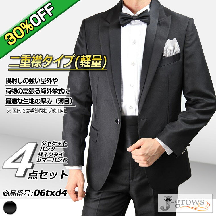 【30%OFF】タキシード ブラック ジャケット パンツ 蝶タイ カマーバンド 4点セット 二重襟タイプ(軽量) 結婚式 フォーマル ウェディング パーティ 演奏会 発表会 披露宴 二次会 ドレスコード クルーズ旅行 シック 高級感 シルエット おすすめ サイズS〜3L 06txd4