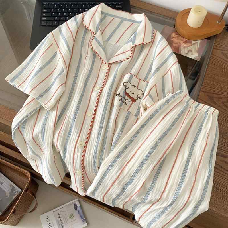 パジャマ レディース 春夏 短袖 短パン セット 襟付き 刺繍 かわいい カートゥーン柄 綿ガウジ 生地 二重 通気性 軽量 吸湿速乾 ゆったり 部屋着 家居服 ルームウェア