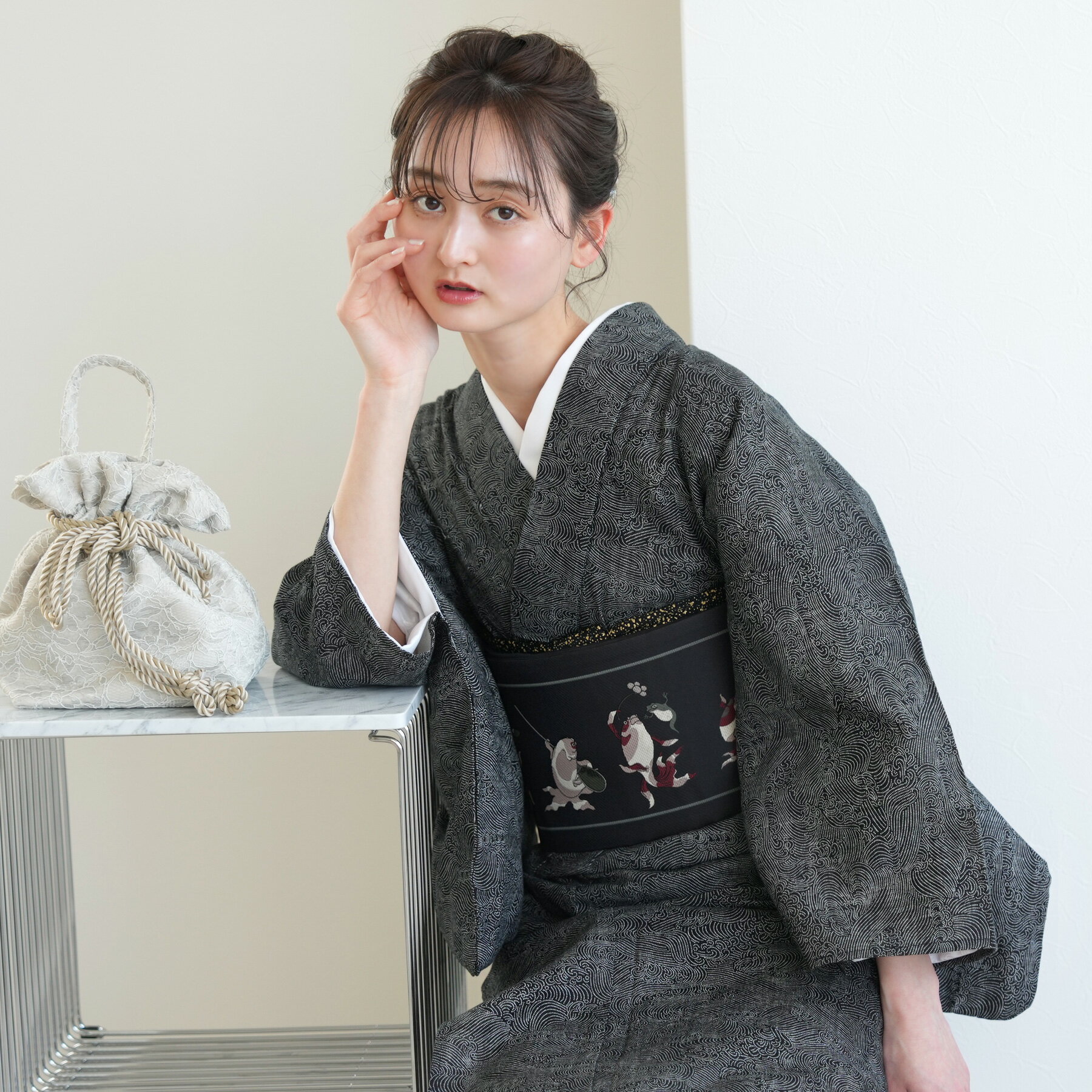 【ニコアンティーク 着物+帯 2点セット 黒の青海波に金魚と猫】着物 洗える着物 単衣 レトロ レディース 帯 細帯 ファブリック着物 黒系 街着 ひとえ カジュアル バチ衿 女性 個性的 和服 日本製 国産