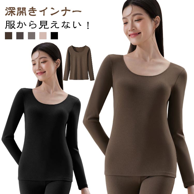 深開き インナー レディース 長袖 発熱インナー あったかインナー 保温 防寒 無地 深あき インナーシャツ 肌着 下着 静電気防止 乾燥対策 肌ケア シンプル 大きいサイズ