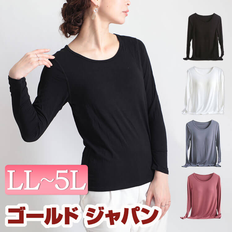 大きいサイズ レディース 長袖インナー ブラカップ付き 立体カップ ノンワイヤー インナー 下着 アンダーウェア カットソー トップス 無地 ブラック グレー ホワイト レッド 黒 白 赤 伸縮素材 シンプル 10分袖 冬新作 秋冬 ゆったり 体型カバー LL 3L 4L 5Lゴールドジャパン