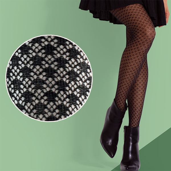 イタリア インポート ブランド レース柄タイツ BC DONNA NICKY レース柄タイツ 黒 きめ細かい幾何学系柄とレース編みの組み合わせがスタイリッシュな 柄タイツ。 マイクロファイバー素材、柄太ももまで、上は非透明切替 ショーツ、つま先補強、コットンマチなし、足形なし。 デニール数 約60 素材 ポリアミド 95% - エラスタン 5% イタリア製