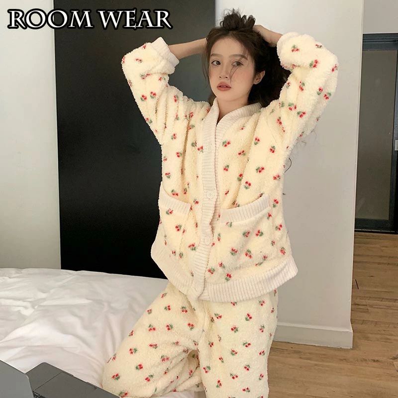 送料無料 ルームウェア サクランボ柄 もこもこ レディース パジャマ 2点セット 部屋着 中厚手 レディース 上下セット 体型カバー 冬用 ふわふわ 秋冬 暖か 贈り物 ギフト 長袖 プレゼント 冬 上下 長袖 ルームニット パジャマ 楽天海外通販