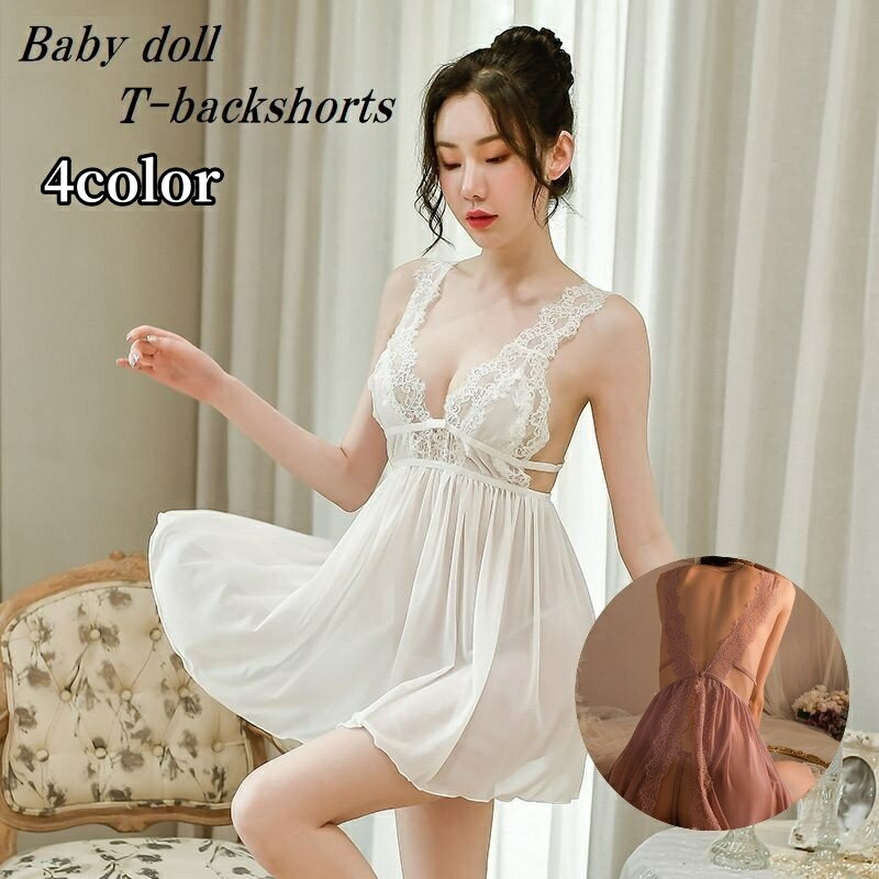 送料無料 ベビードール Tバックショーツ 2点セット レディース 女性用 インナー 下着 ランジェリー セクシー 深Vネック レース ミニ丈 透け感 シースルー 背中クロス おしゃれ フェミニン 可愛い 大人女子 ナイトウェア