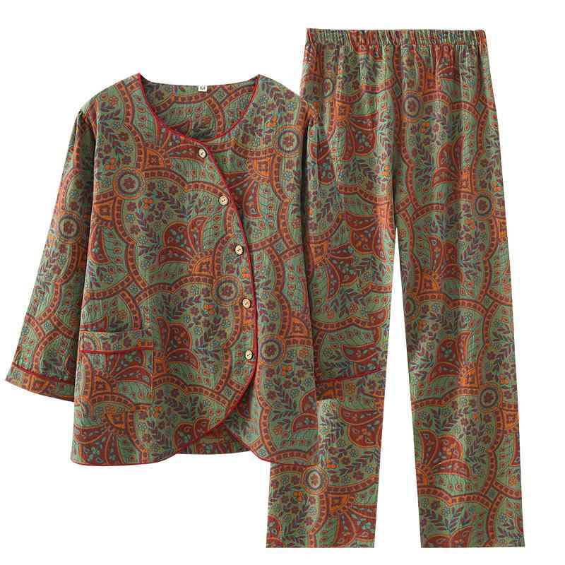 パジャマ ガーゼ レディース 綿 女性用 夏 薄手 上下セット トップス ズボン ホームウェア 通気性 ラウンドネック ボタン 前開き ウエストゴム プリント 柄 緑 茶色