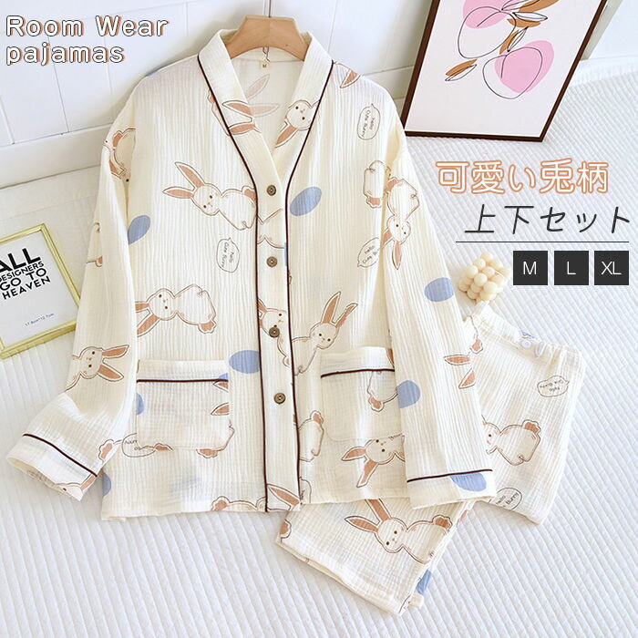 部屋着 ルームウェア 綿100% パジャマ ノーカラー 2点セット レディース 女 ホームウェア 柔らかい 肌触り ナイトウェア セットアップ コットン 女の子 兎柄 可愛い 前開き 寝巻き 着心地 吸湿 通気 大人 入院 ゆったり リラックス ギフト 母の日 春 夏 送料無料