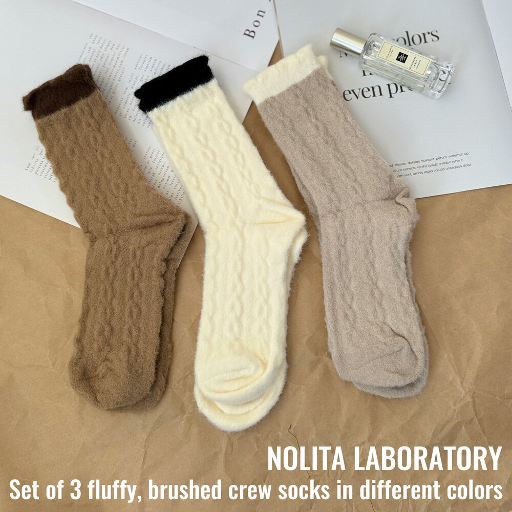 \楽天マラソン/【 NOLITA / ノリータ 】3足組 ふわふわ あったか タイプ違いの ケーブルニット 起毛 クルー ソックス 靴下 ブラウン モカ ベージュ アイボリー