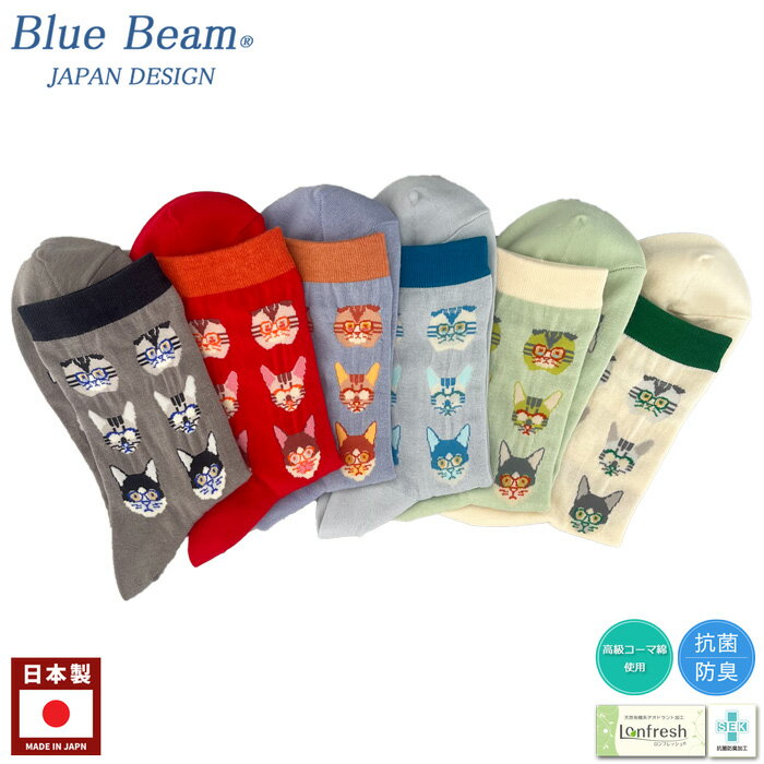レディース カジュアルソックス 日本製 靴下 ねこ 顔 めがね クルーソックス クルー丈 丈長め スニーカー 5色 くつ下 23〜25cm 23-25 23 24 25 かわいい おしゃれ カラフル 抗菌 防臭 綿 送料無料 コスプレ 仮装 メンカラ レッド グレー ブルー グリーン パープル 白