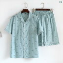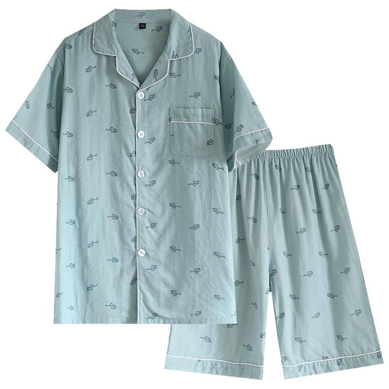 パジャマ ガーゼ メンズ 夏 薄手 ゆったり 半袖 短パン 部屋着 ナイトウエア ウエストゴム 前開き 柔らかい 吸汗 通気性 二層織り 父の日 プレゼント シンプル カジュアル 緑 青 メガネ柄