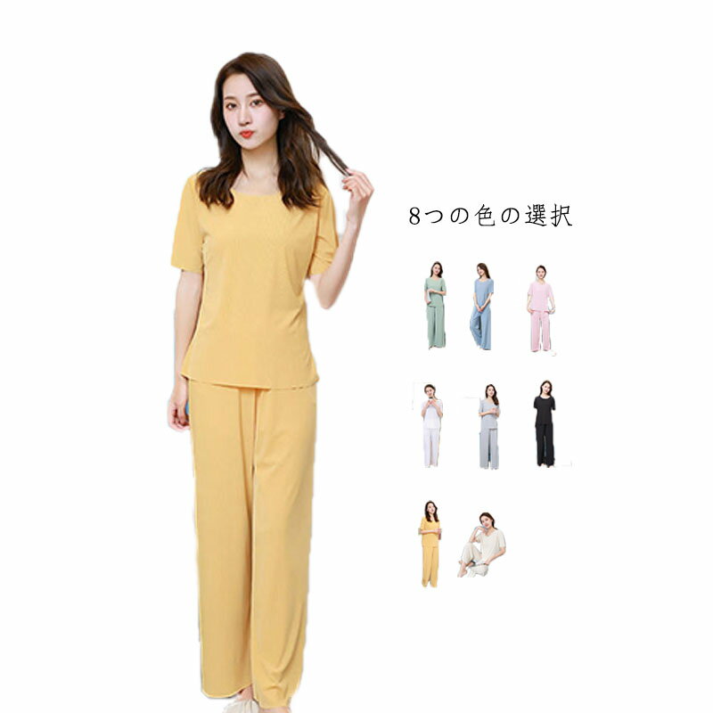 ナイトウエア 春夏秋 レディースパジャマ 無地 上下セット レディース パジャマ ナイトウェア 冷房対策 ゆったり ルームパジャマ 部屋着 セットアップ ロングパンツ パジャマ パジャマ シンプル 寝巻き 半袖パジャマ
