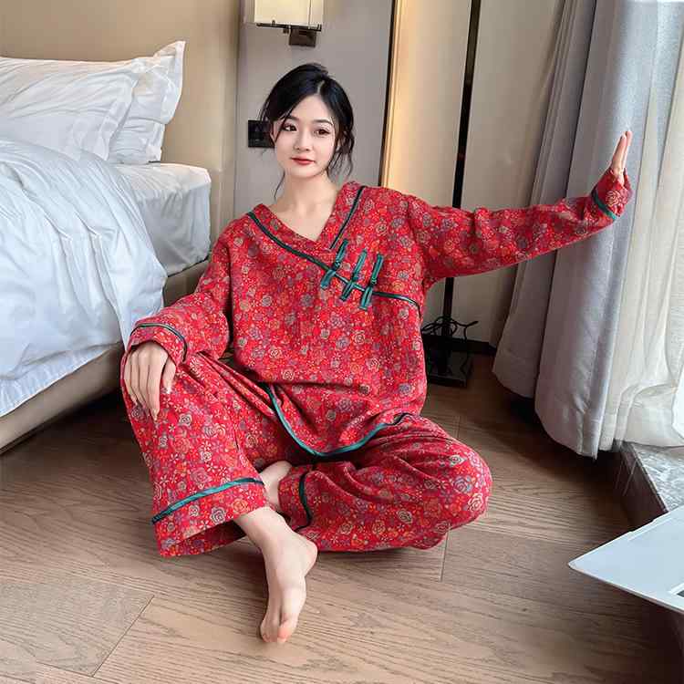 パジャマ レディース 大きいサイズ Vネック 長袖 上下セット 綿 春秋 民族風 ルームウェア 古風 快適 レッド ピンク系