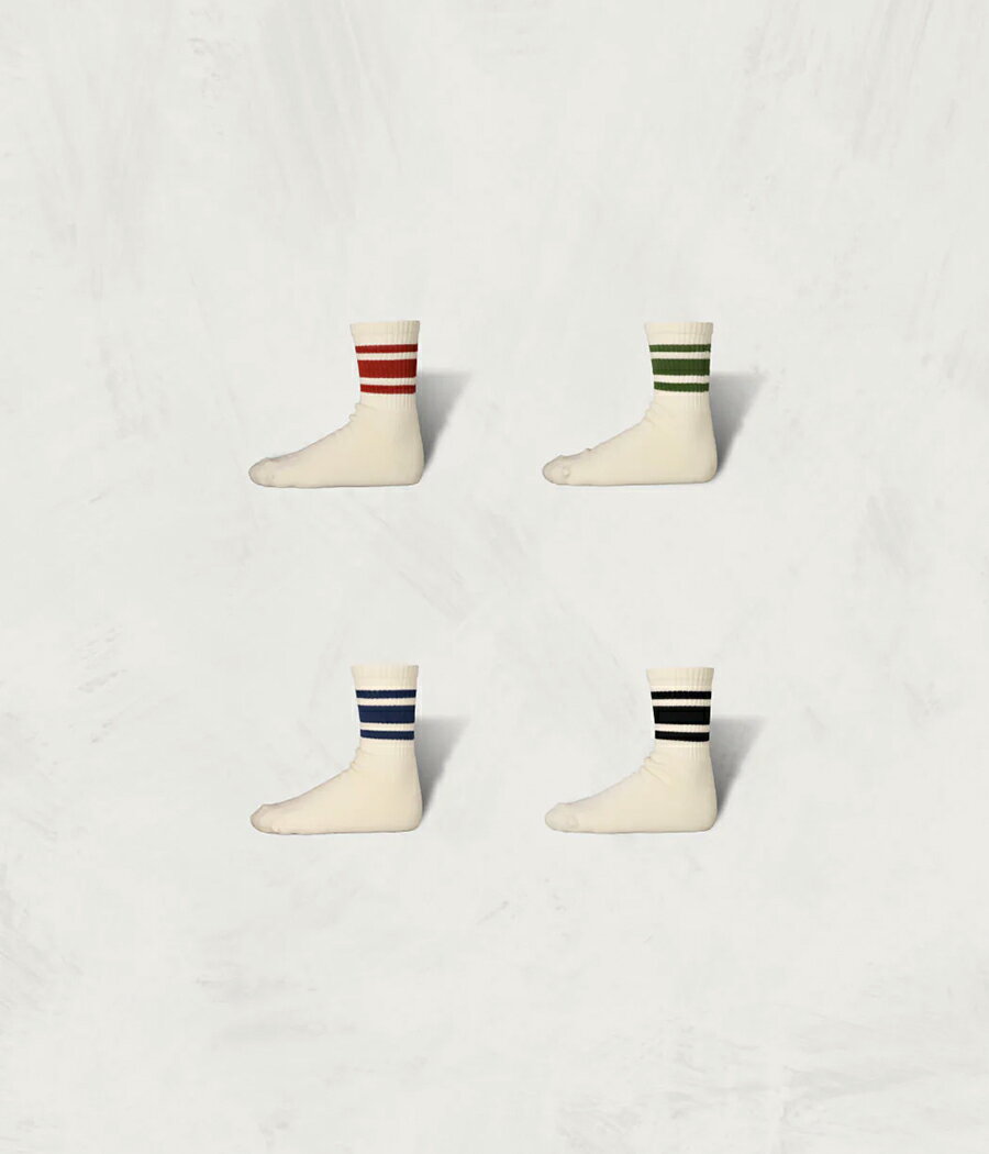 スケーターが一つのカルチャーとして成熟した80年代。70年代に主流だった19インチのハイソックスに変わり普及していったミドル丈のスケーターソックスをショート丈に作り替えた。80年代の西海岸の雰囲気に足された品質が程よい違和感を演出している。 ・モニターの発色により、実物と異なる場合がございます。 商品番号 de-40 モデル 80's Skater Socks | Short Length 販売価格 ¥2,000 + tax シーズン オールシーズン 素材 82% Cotton, 16% Polyester, 2% Polyurethane 返品可否 返品不可