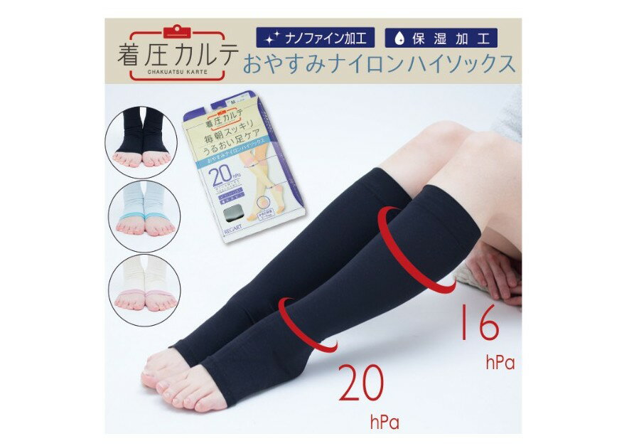 【日本製】おやすみナイロン ハイソックス ブラック オフホワイト アクア 着圧カルテ 就寝時兼用 オープントゥ 無地 靴下 美脚効果 着圧 むくみ 血行促進 リンパ 足首 ふくらはぎ 引き締め ナノファイン加工 ソックス くつ下 立ち仕事 デスクワーク オフィス レディース