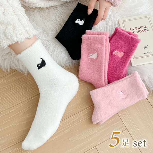 【5足セット】ソリッドカラー キャット柄 ふわもこ クルー ソックス 女性 レディース 靴下 シューズ 春 秋 冬 カジュアル 単色 無地 防寒 あったか 厚手 ソフト もこもこ ニット フリース 着まわし 部屋着 ねこ アニマル ワンポイント 刺繍
