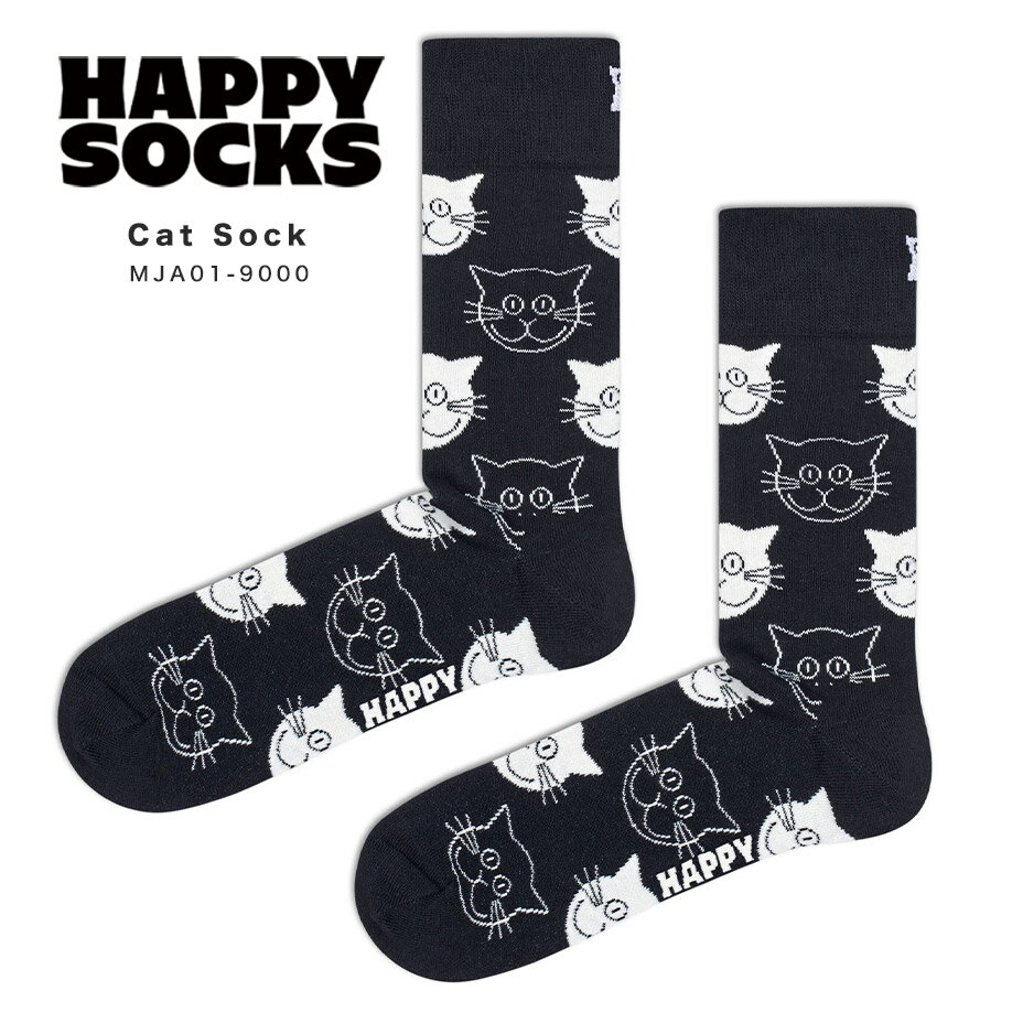 happy socks ハッピーソックス 靴下 レディース メンズ ブランド プレゼント かわいい おしゃれ クルー丈 ソックス くつ下 可愛い 綿混 カジュアル ビジネス アニマル柄 キャット 猫 総柄 ブラック 黒 ギフト 誕生日 Cat Sock MJA01-9000 2025 秋 秋冬 冬