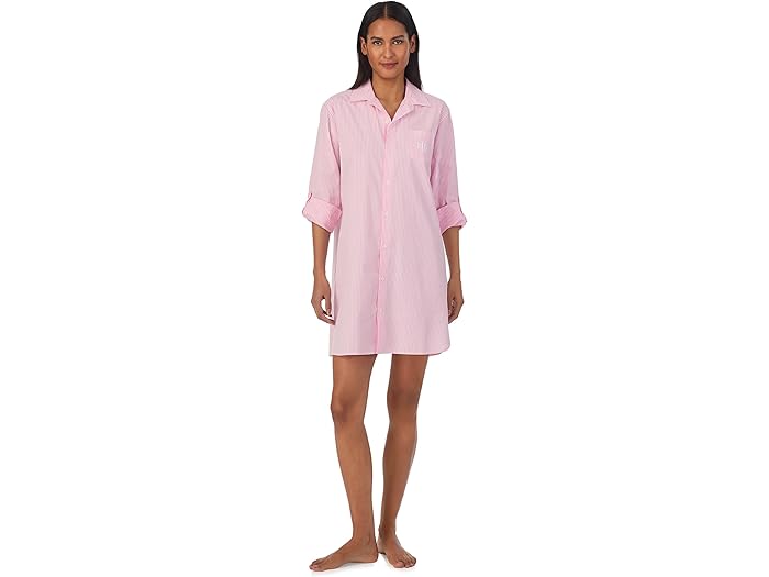 (取寄) ローレン ラルフローレン レディース ロング スリーブ ロール タブ ヒズ シャツ スリープシャツ Lauren Ralph Lauren women Long Sleeve Roll Tab His Shirt Sleepshirt Pink Stripe