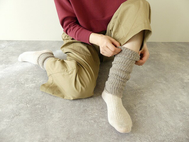 英国の編み機メーカー「ベントレー」製のオールドマシーンで編み立てたスラブリブソックス。 別注色のオーガニックコットンをたっぷりと使い、1周の針数わずか44本のローゲージ編み機で ざっくりと編み立てました。ふっくらとボリュームのある1足です。 DETAILS [SIZE]22.5-24.5cm [LENGTH]レギュラー丈 [QUALITY] 綿92% ナイロン7% ポリウレタン1% CARE ・液温は30℃を限度とし、洗濯機で非常に弱い洗濯ができる。 (手洗い推奨。洗濯機を使用する場合はネットに入れる。) ・日陰のつり干しがよい。 ・漂白剤・乾燥機・ドライクリーニング・アイロン禁止。