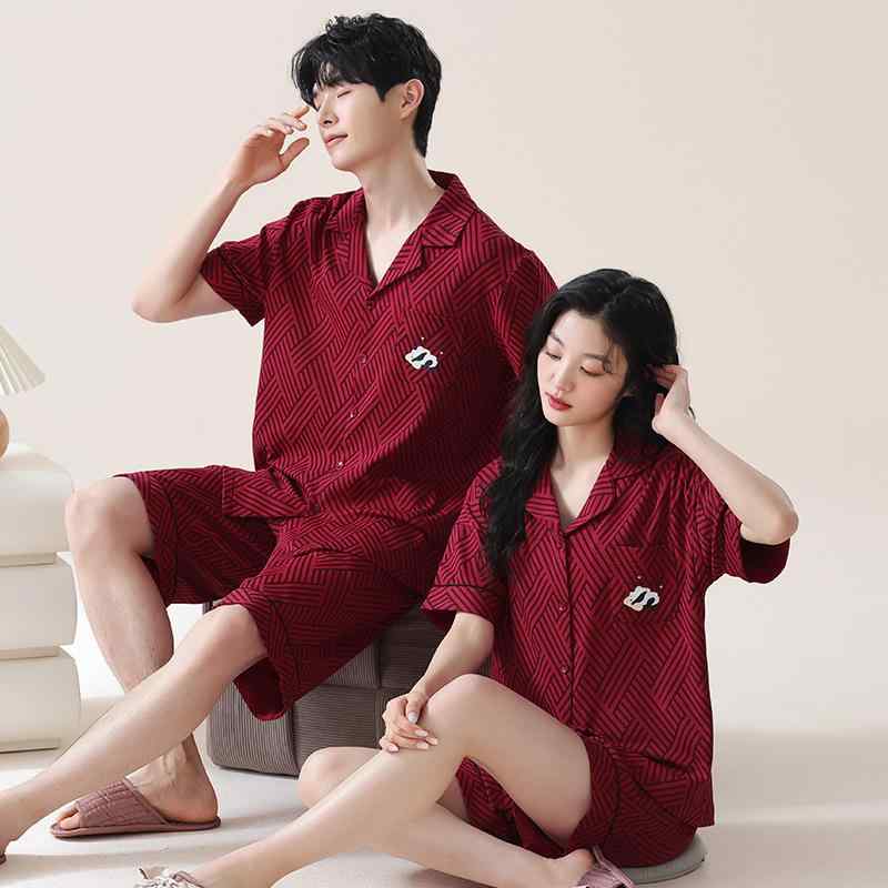 パジャマ カップル ペア メンズ レディース 綿100% コットン 接触冷感 半袖 前開き 上下セット ショートパンツ 薄手 通気性 ストレッチ 伸縮性 新婚祝い ブライダル ルームウェア 部屋着 赤