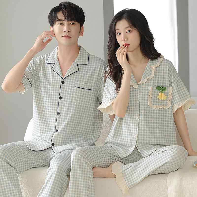 パジャマ カップル ペア 男女兼用 ユニセックス 綿 コットン ソフト 柔らかい 伸縮性 ストレッチ 半袖 長ズボン Vネック セットアップ チェック柄 シンプル カジュアル ルームウェア 部屋着 普段使い おうち時間 通気性 快適 上質 春夏秋