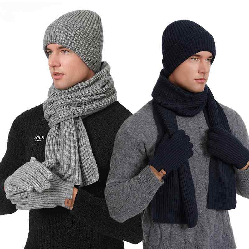 ニット帽 メンズ 男性用 ウール 秋冬 防寒 3点セット ニット帽子 マフラー 手袋 ブラック グレー