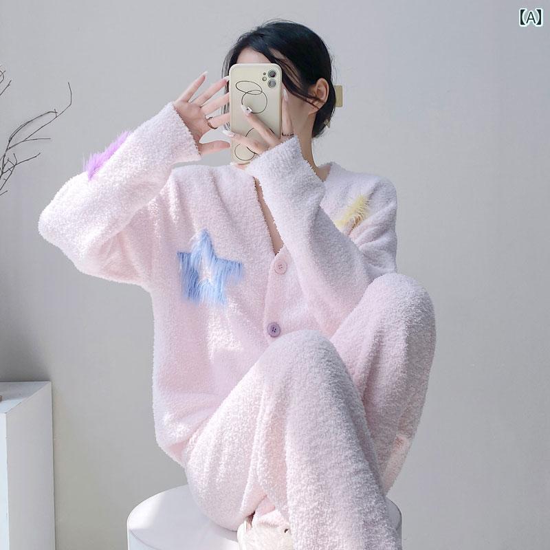レディース ルームウェア かわいい 2024年 レディース パジャマ 秋冬 コーラル ベルベット 裏起毛 厚手 かわいい 星 半端 ホームウェア