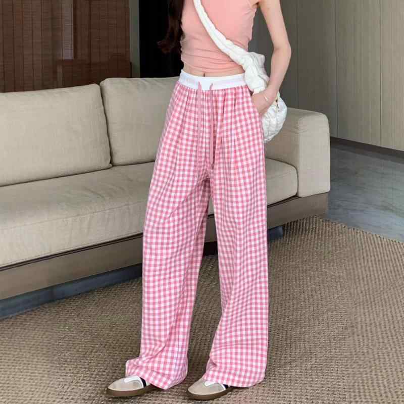 パンツ レディース 格子柄 ワイドレッグパンツ ポリエステル 高腰 ゆったり ストレートパンツ カジュアル 薄手 春夏 ブラック ブルー ピンク系 グリーン イエロー