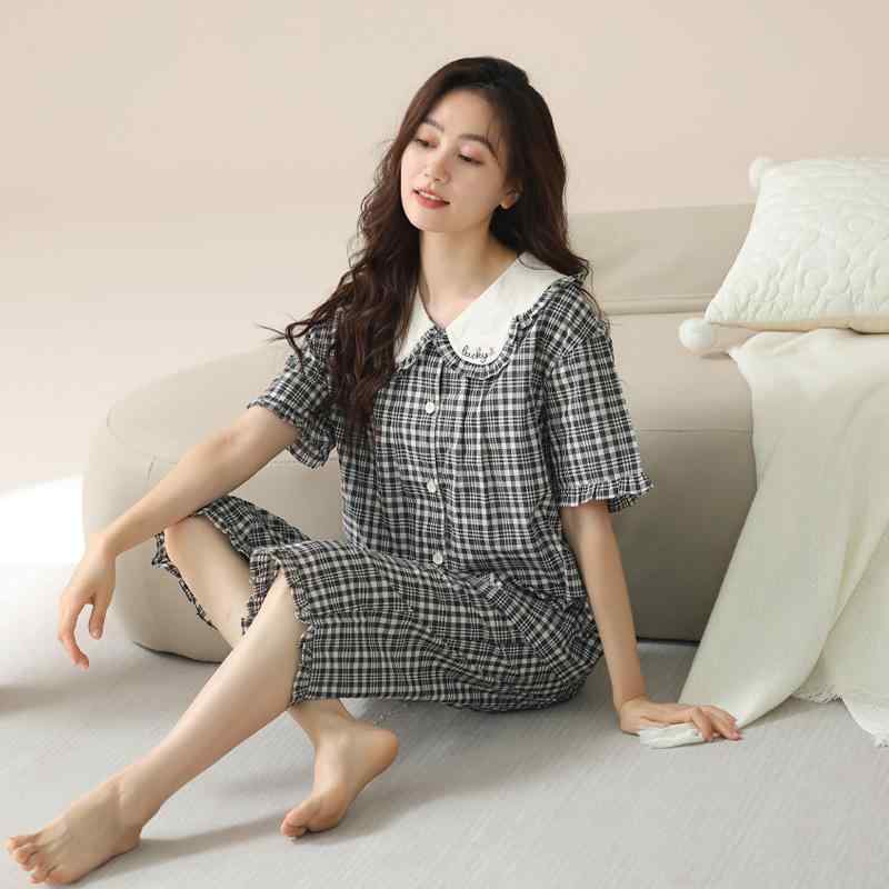 ・カテゴリ: パジャマ・スタイル: カーディガン・テイスト: スウィートキュート・主な素材: 綿100%・厚さ: 薄手・ネックライン: 付け襟・袖丈: 半袖・パンツ丈: 七分丈・機能: 透湿性、ストレッチ性、保温性・対象: ミセス・着用シーン: ルームウェア、普段着・カラー展開: ブラック、エビ色・サイズ展開: M、L、XL、XXL
