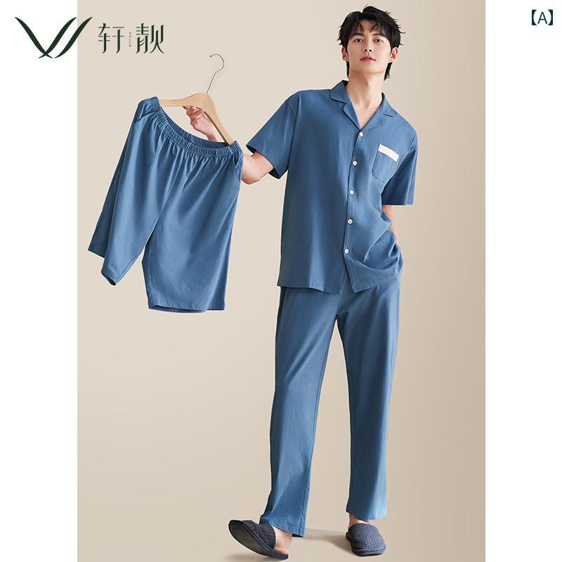 ルームウェア セット内容: 3点セット デザイン: 切り替え装飾あり パンツ丈: ロング 素材: 綿 パンツ仕様: ウエストゴム 用途: パジャマ 厚さ: 薄手 袖丈: 半袖 襟型: 小さな折り襟 柄: 無地 前開き仕様: 前ボタン 性別: メンズ カラー: ダークブルー