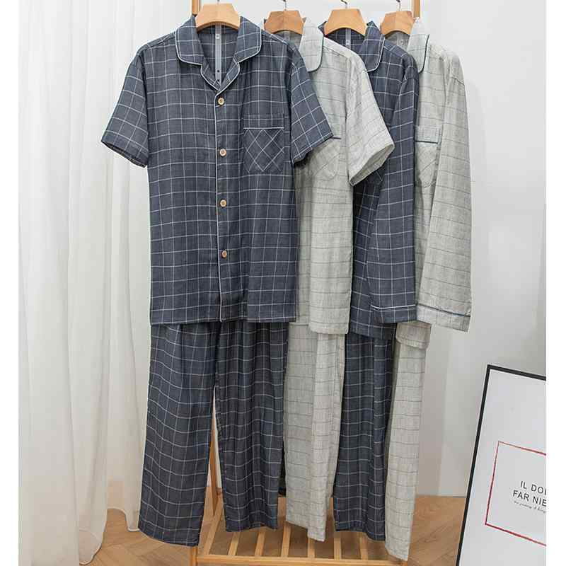 ・カテゴリ: パジャマセット・素材: 綿100%二重ガーゼ・厚さ: 薄手 (約101-120g/平米)・ネックライン: 襟付き・袖丈展開: 長袖、半袖・パンツ丈: 長ズボン・機能: カジュアル、通気性、睡眠、湯上り、部屋着、快適・対象: 若年男性・着用シーン: 部屋着・カラー展開: 紺チェック、グレーチェック・サイズ展開: S、M、L、XL、XXL・測定誤差: 約1-3cm・柄: 大判チェック