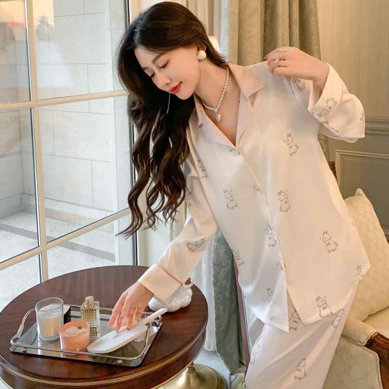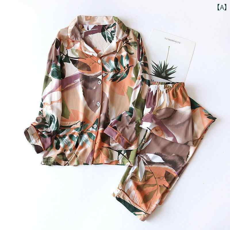 女性用 パジャマ 綿 シルク風 春夏 長袖 薄手 レーヨン プリント カジュアル ホームウェア 上下セット