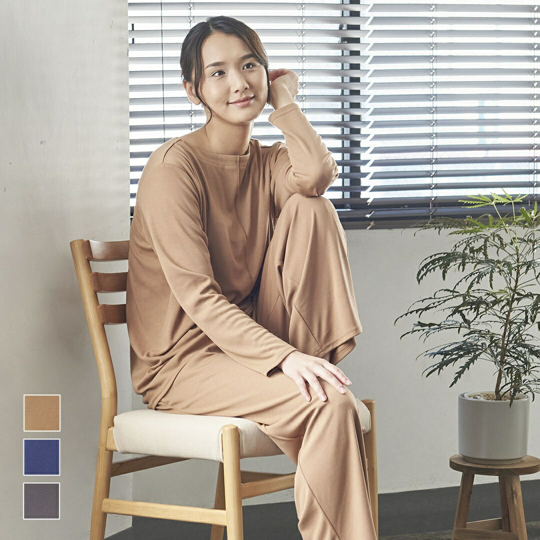ユーカリなどを原料に作られるリヨセル混の、ムレにくく肌触りがとてもなめらかなパイル生地を使用しました。ずっと着ていたくなる心地良さの7分袖トップス×ロングパンツのセットです。就寝時もゆったり締め付けず快適な着心地です。・ユーカリなどを原料に作られるリヨセルを使用した蒸れにくいパイル生地・脇に縫い目のない肌にやさしい縫製・細番手の糸で仕上げたパイルはふんわりやわらかくなめらかな風合いが魅力・身体のラインをひろいにくいきれいな落ち感とゆったり形状で締め付けない・トップスは後ろを長めにした前後差をつけ、気になるお尻まわりも隠れるデザインに・パンツはウエストゴム+引っ張っても抜け落ちない紐でウエスト周りの調整可能・パンツにポケット2つ付き-------------------透け感:なし(ベージュはややあり)厚さ:普通伸縮性:なし裏地:なし光沢感:なし-------------------サイズ:フリーサイズ/トップス:バスト79〜94cm、肩幅=42cm、身幅=105cm、着丈=前65cm・後70.5cm、袖丈=55cm、裾幅=105cm、パンツ:ウエスト=最小64cm〜最大83cm、ヒップ=101cm、渡り=30cm、股上=32cm、股下=64cm、裾幅=25cm ※寸法には若干の誤差が生じる場合があります。カラー:ネイビー、ベージュ材質:再生繊維(リヨセル)80%、ポリエステル20%生産国:中国【取扱い上の注意】 ・洗濯の際はネットを使用し他のものと分けて洗ってください。 ・漂白剤や 蛍光増白剤入り洗剤を使用しないでください。 ・洗濯した際に多少縮みや外観変化が生じる場合があります。 ・生地組織の特性から糸の浮きが多いため、引っ掛かりにはご注意ください。特にアクセサリーや表面のザラついたものと摩擦しないようにご注意ください。 ・糸が飛び出した際は、飛び出た糸をハサミで切ってください。 ・生産の都合上、糸が飛び出していることもございますがご了承ください。 ・摩擦により毛羽立ちや毛玉、色落ちや色移りが生じる場合があります。 ・やわらかく織り上げておりますので毛羽落ちします。