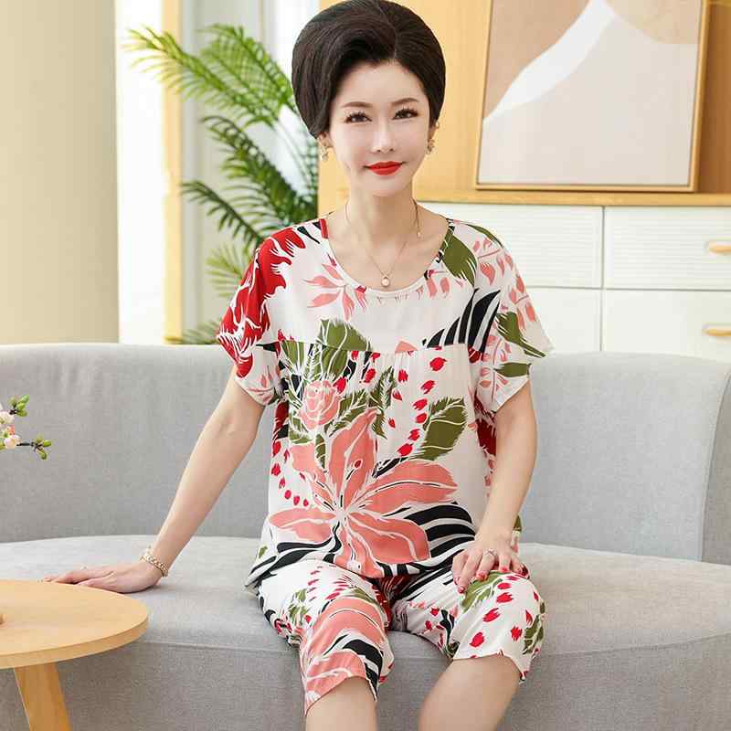 ・カテゴリ: セットアップ・スタイル: 文芸風・デザイン: プルオーバー・主な素材: 綿レーヨン混紡(レーヨン30~50%)・生地厚さ: 適度(141-160g/平方メートル)・ネックライン: クルーネック・袖丈: 3分袖・パンツ丈: ショート・特徴: リラックス、通気性、ルームウェア、涼感、快適、外出可能・対象: ミドルエイジ女性・シーン: アウトドア、ホームウェア・サイズ展開: XL, XXL, XXXL, XXXXL, XXXXXL