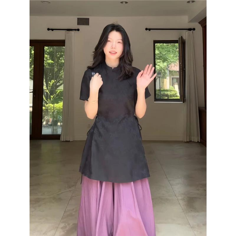 セットアップ レディース 大きいサイズ 新中式 トップス パンツ 三菱美雅碧 収腰 ゆったり ワイドレッグパンツ アクリル 無地 S M L XL 2XL 3XL 4XL