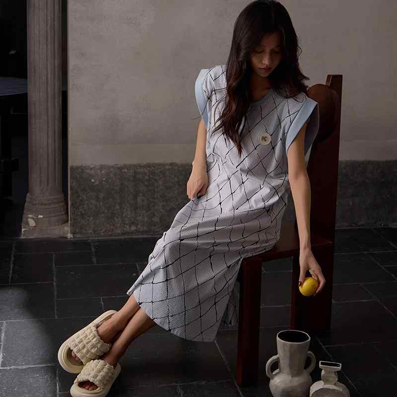 ・スタイル: スイート・デザイン: プリント・対象: 若年層・生地重さ: 200g以下・用途: パジャマ・主な素材: 綿・生地加工: プリント・厚さ: 薄手・袖丈: ノースリーブ・丈: ロング丈・裏地素材: 綿・ネックライン: クルーネック・開閉タイプ: プルオーバー・柄: チェック・サイズ展開: M、L、XL、XXL、XXXL・カラー: ライトブルー