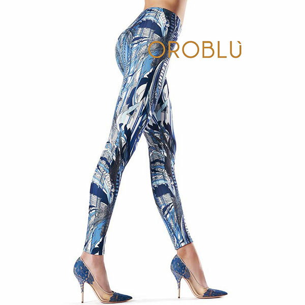 イタリア インポート 高級 ストッキング タイツ ブランド OROBLU MYTHICAL スカーフ柄レギンス(ジェギンス) カラー:ブルー 黄色スカーフのような柄がかっこいいレギンス(ジェギンス)。ストレッチ性の高い高級素材、透け感が全くないため通常のパンツとしてもお洒落に着こなせます。10分丈、ウェストゴム入り。●素材:95%ポリエステル、5%エラスタン●タイプ:デザインレギンス(ジェギンス)●イタリア製サイズ Sウェスト68 ヒップ82 股上27 わたり48 裾一周24 内股75Mウェスト72 ヒップ86 股上27 わたり50 裾一周24 内股75Lウェスト76 ヒップ90 股上27 わたり52 裾一周25 内股75