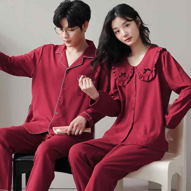 ルームウェア パジャマ カップル 結婚祝い 高級感 レッド 綿100% 長袖 長ズボン Vネック セットアップ 大きいサイズ 快適 伸縮性 通気性 オールシーズン