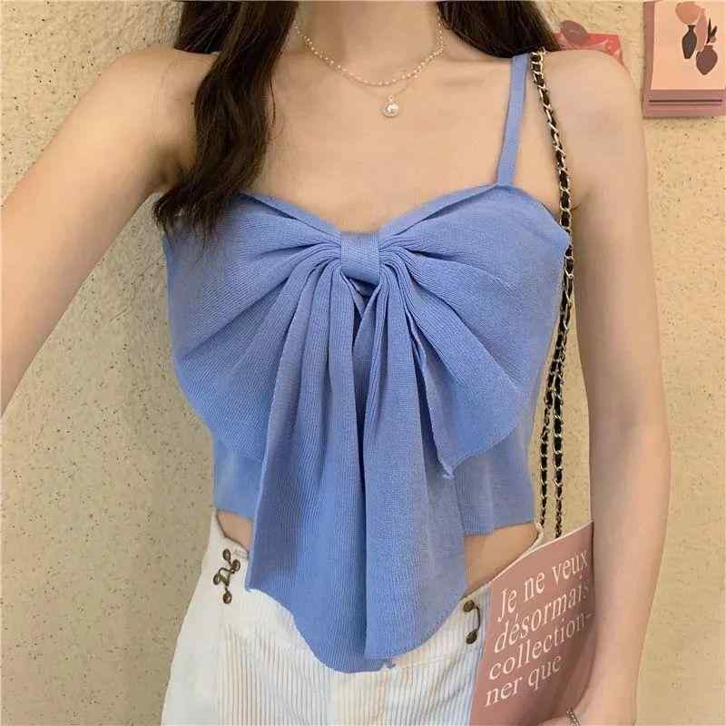 キャミソール レディース 春夏 ブルー 青 蝶々 リボン 韓国風 ノースリーブ トップス プルオーバー ポリエステル 無地 スリム ショート丈 カットソー