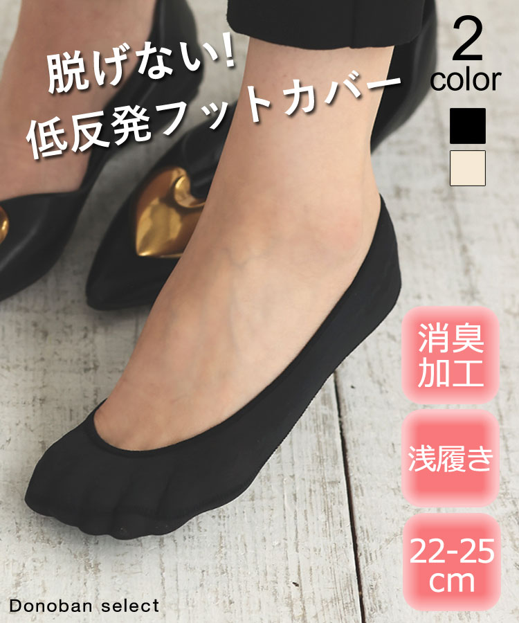 ■商品名 Donoban select クッション付フットカバー ■サイズ(cm) 22-25cm ※平置き採寸のため若干のブレがございます。 ■生地感 透け感:なし、裏地:なし、生地の厚さ:薄手、伸縮性:あり ■カラー ブラック、ベージュ ■素材 [本体]ナイロン、ポリエステル [滑り止め部分]シリコン [クッション表]ポリエステル [クッション中材]ウレタン ■商品説明 歩くたびにカカトからすぐに脱げる。 靴の中で丸まって気持ちが悪い。 パンプスからはみ出てかっこ悪い。 前滑りしてつま先が痛い。。。 脱げないのは当たり前! 低反発クッション、消臭加工付きのフットカバーが登場! 内側の履き口部分にぐるっとシリコンゲルの滑り止め付き。 太いシリコンだと、お肌が弱い方は肌が擦れて痛かったりかゆくなったりしてしまうこともありますが、こちらは細い波型のシリコンが二重にぐるっと付いているので肌あたりも優しく、なおかつ肌に密着してズレや脱げにくい仕様です。 つま先側の内側に低反発クッションが入っているので靴との摩擦から足を優しく守ってくれます。 糸から消臭加工を施しているのでフットカバー全体に強力な消臭効果が! 伸縮性抜群で足に吸い付くようにピッタリフィット! 吸汗、速乾に優れたナイロン素材を使用しているので通気性抜群! 四季問わずに履いていただけます。 ■ご注意 ■入荷時期によりお色、長さが多少異なる場合がございます。 ■撮影場所やイメージにより実際の商品と色味が若干異なる場合がございます。商品のお色味はカラーバリエーション画像をご参照ください。 ■なるべくきれいな状態で発送致しますが、製造工程上、輸送の際の汚れや擦れ等が若干見られる場合がございます。 ■雨、摩擦により色落ちする場合がございます。 あらかじめ上記事項をご理解ご了承のうえ、お買求めくださいませ。